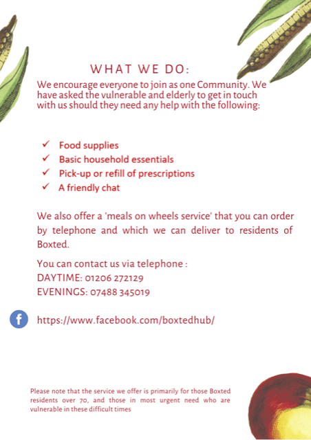 The Boxted Community Hub is doing great work in putting together a relief strategy for the most vulnerable in Boxted in these difficult times.In order for them to start making up care packages, Bonny and Heidi would be very grateful for donations of non-perishable items of food( rice, pasta, tins, flour etc) as well as any spare loo roll! The elderly are finding it nearly impossible right now to buy anything themselves, and it will be even worse if the over 70’s are made to stay permanently indoors.