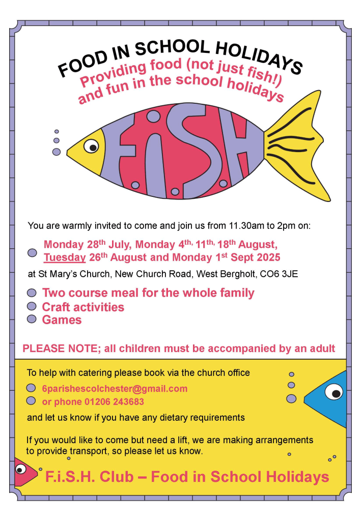 The Zone for 6-11 year olds 5.30pm-7pm and the Edge for 12-18 year olds 7.30pm-9.00pm. Fortnightly during term time at St Peter’s Church. Contact Linda Sheil 01206 273324